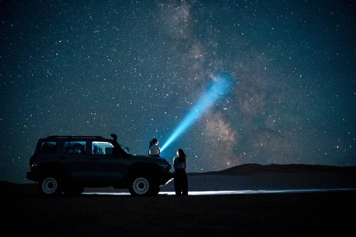 傍晚,在沙漠星空下我们一起围绕篝火,品味新疆特色美食烤全羊,载歌载舞。