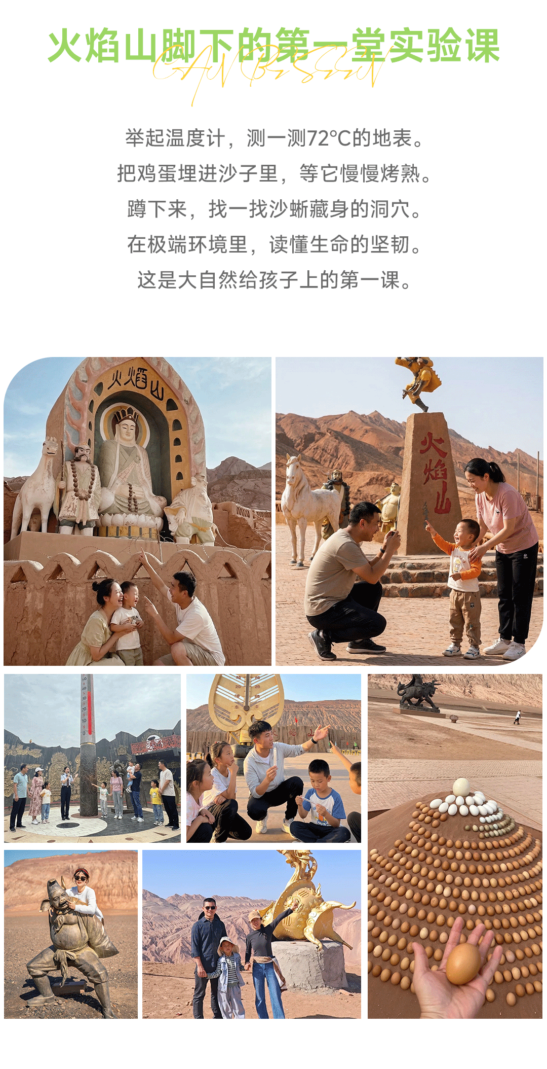 途中经过火焰山,寻找孙悟空体温计实测地表72度,观察赤色山体,接受“烈焰”炙烤,体验沙窝烤鸡蛋,把“西游记”从必须名著变成生存指南。