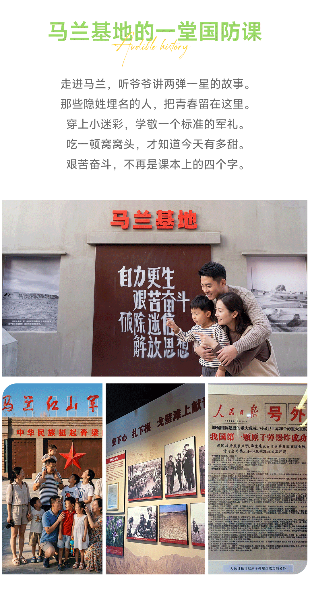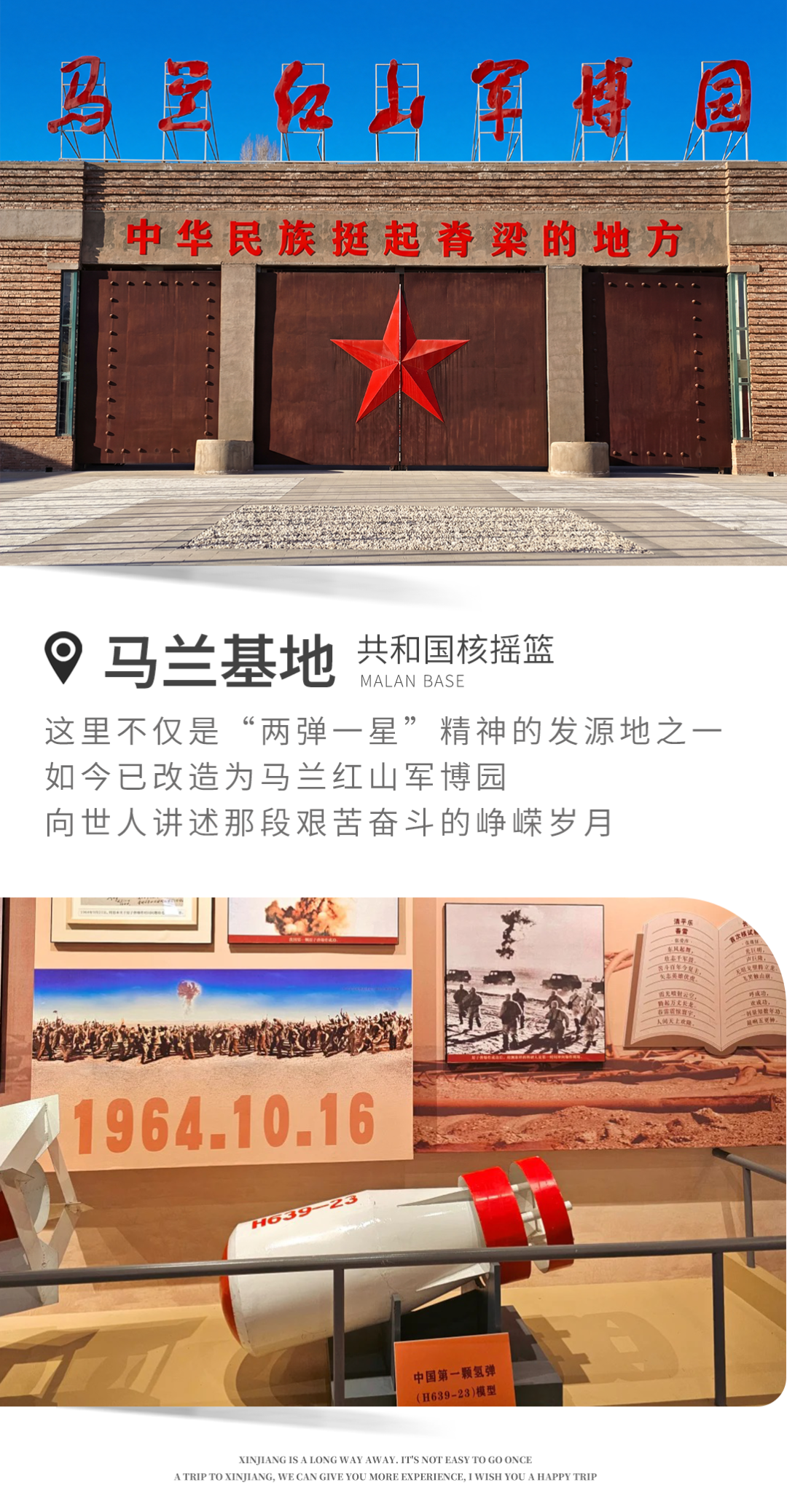 下午驱车前往马兰基地,参观牧民七次搬迁广场,马兰烈士陵园,向先烈进行缅怀。随后参观马兰红山军博园,深切 “马兰精神” 和 “两弹一星” 精神的理解与感悟。