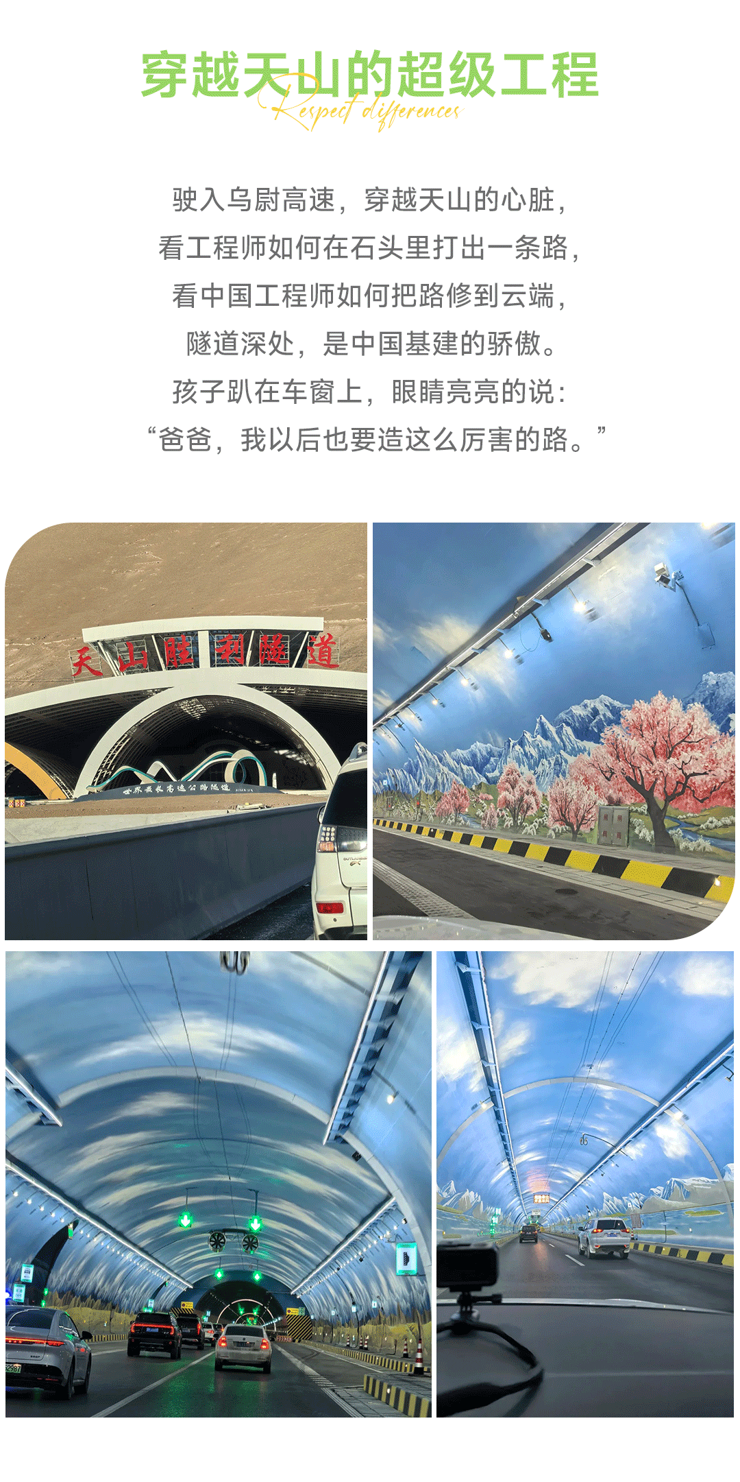 中午县城用餐,驶入世界最长高速公路隧道,一路翻越天山,感受科技与美景的结合,体验中国基建的魅力。