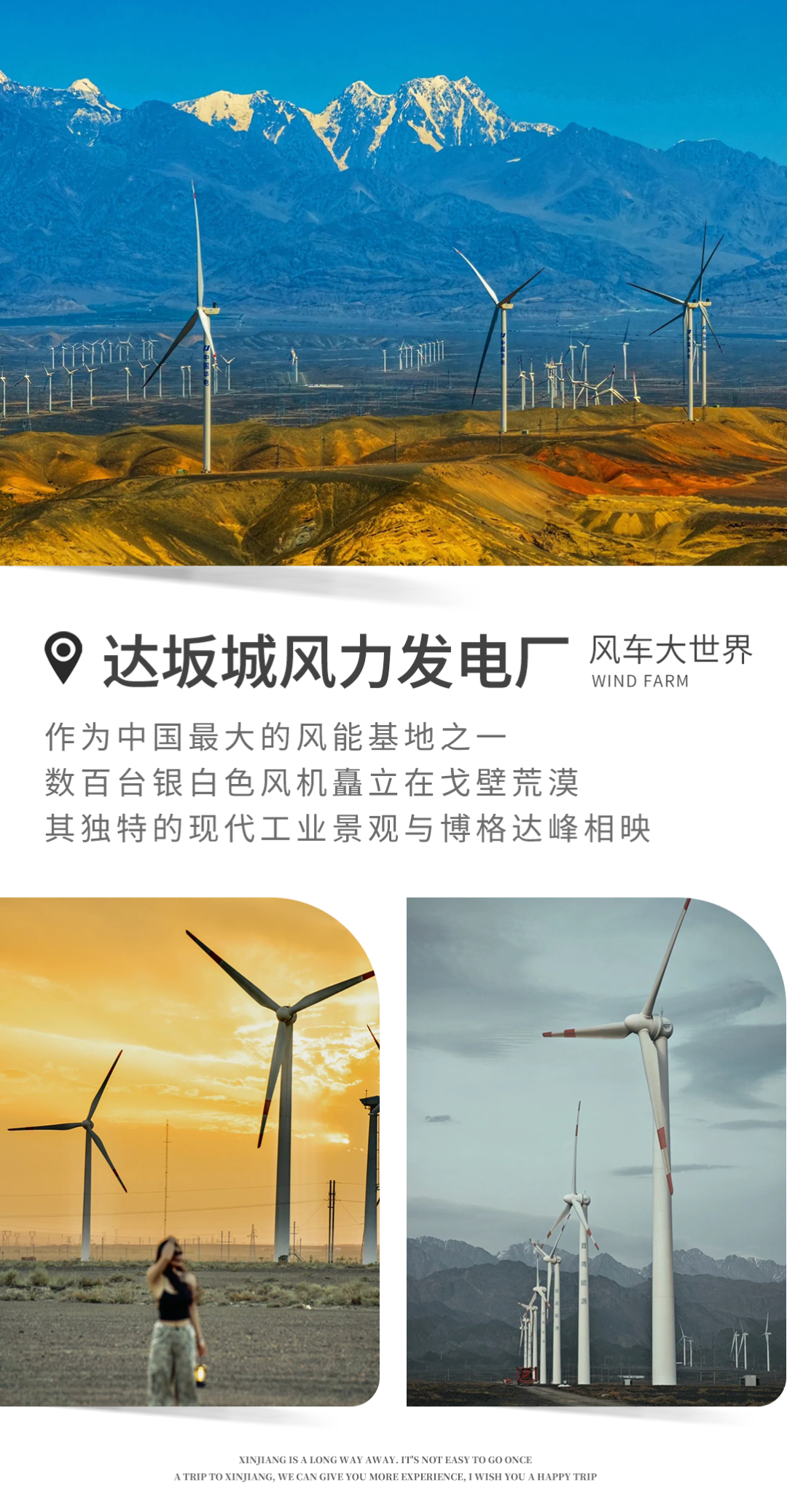 早餐后出城,一路观看风力发电群,乘车抵达中国风谷“达坂城风电场”,前往工厂参观,了解风力发电机的制造,学习风的形成利用,感受中国制造的魅力。