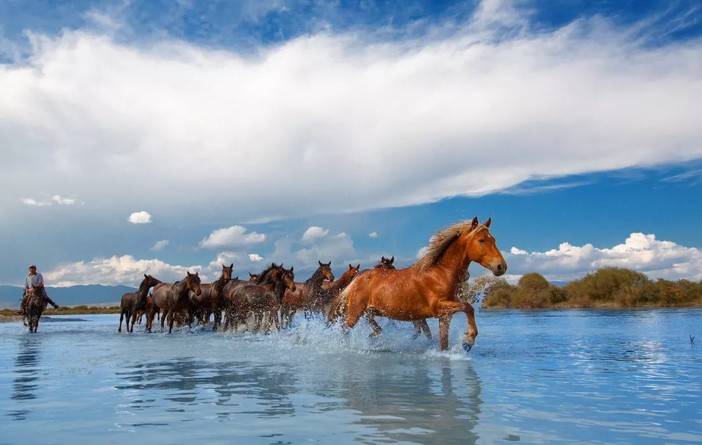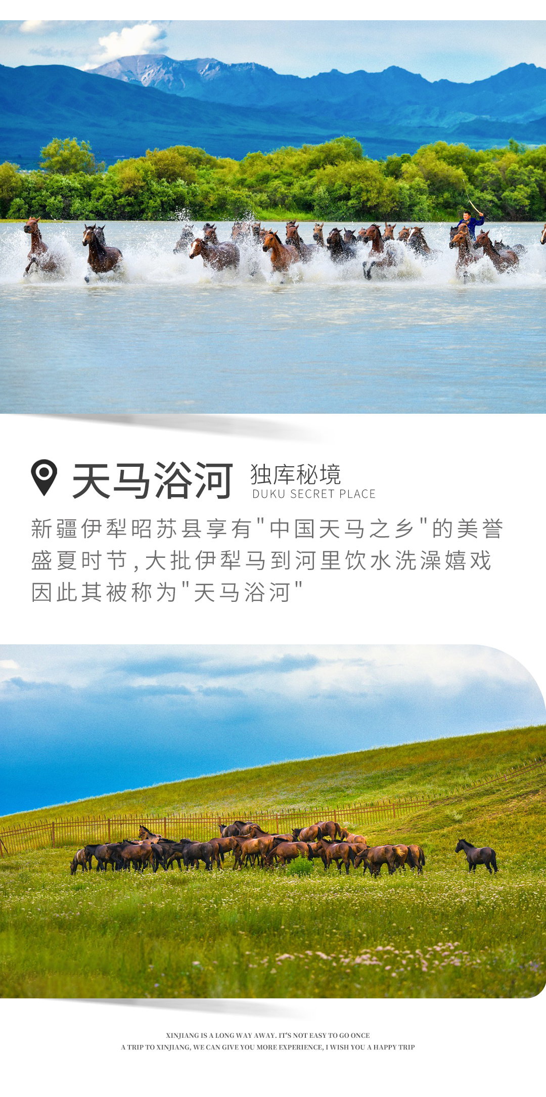 早餐后约8点前往昭苏湿地,这里是伊犁州面积最大、海拔最高的高原湿地,也是中国为数不多的典型高原湿地公园,公园里森林茂密,芦苇丛生,水禽姿态优雅,争奇媲美,百鸟齐鸣,清脆悦耳,飞翔觅食,婀娜多姿。在这里,天蓝得过份,花开得放肆,景美得醉人,徜徉其中,整个身心都会彻底放松下来。新疆伊犁昭苏县享有"中国天马之乡"的美誉。盛夏时节,大批伊犁马到河里饮水洗澡、嬉戏奔腾,被称为"天马浴河"。2022年6月以来,昭苏县在湿地公园每天举行两次“天马浴河”节目表演。每次有40匹“天马”参加表演,牧民从山上赶着马匹一路驰骋而下,走近河岸。赶马人一声吆喝,马会立即在岸边停下来,稍微休整二三分钟,然后赶马人又一声号令,马瞬间跳进河流奋蹄奔腾而起,河面上水花飞溅四射,场面壮观奇美。