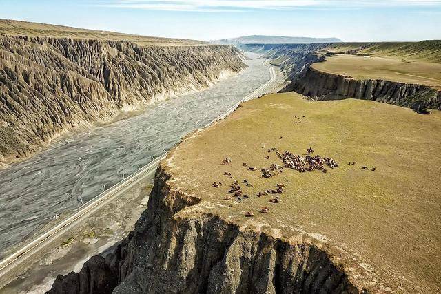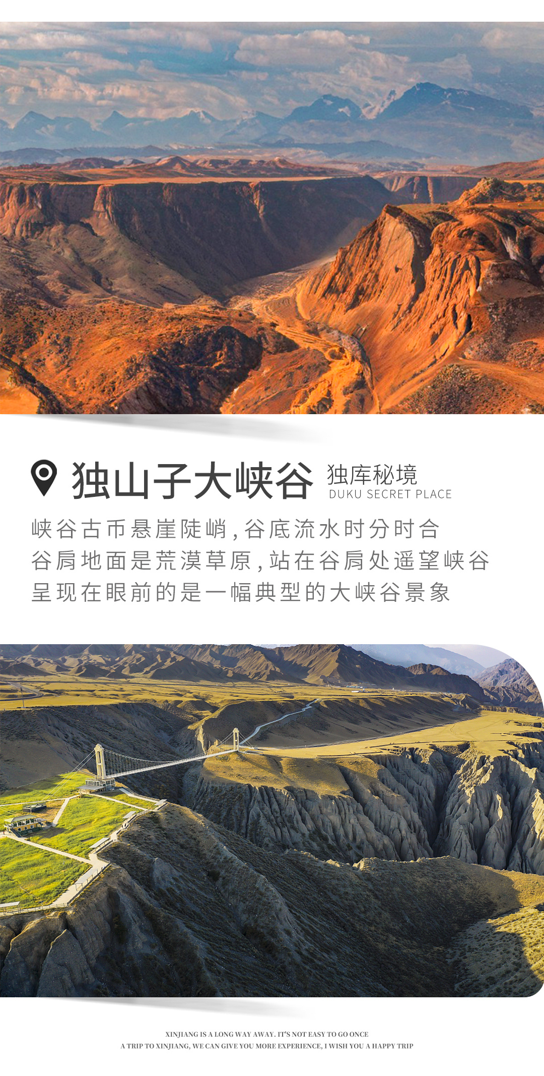 早上用完早餐后出发,行车约3个半小时,抵达我们的第一个目的地——独山子大峡谷。 我们将拥有"独库秘境,亿年奇观"之称的独山子大峡谷作为我们行程的第一站,河水冲出天山后,切割独山子西南方向倾斜平原形成的神奇风光峡谷,峡谷两岸的阶地历历在目,至少可分9级,阶地面上是荒漠草原,生长着蒿类、针茅等。在独山子境内奎屯河流经独山子大峡谷之中峡谷近南北走向,峡谷古币悬崖陡峭,谷底流水时分时合,谷肩地面是荒漠草原,站在谷肩处遥望峡谷,呈现在眼前的是一幅典型的大峡谷景象。 天山雪水及雨水流下来经过这里的土壤形成的冲积沟壑,在谷壁雕凿出这些奇特景观。属峡谷地势样貌。曾荣登国家地理杂志,全国最美公路独库公路第一景,电视剧《九州缥缈录》、电影《飞驰人生》拍摄取景地。