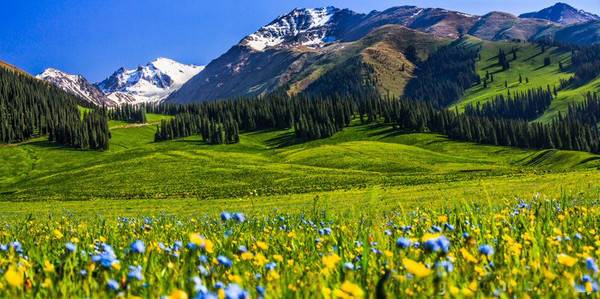 之后我们前往夏特古道。夏特也称为夏塔,连接天山南北,在户外圈中名气很大,被户外界称为“玄奘之路”,多年以来,穿越夏特古道是很多强驴心中的夙愿。今天我们安排大家行走的是景区内最精华的一段休闲线路,一路上绿草茵茵,鲜花满布,中间的夏特河水时缓时急,奔流向前。天气好的话,天山山脉第2高峰---汗腾格里峰清晰可见,一览无余的展现在你的面前,而且一路上也可以看到很多的旱獭(土拨鼠)在草地坡地上晒太阳或是四处乱窜。随后前往特克斯入住。前往路上风光也依然很美,每年5月底阳光下的昭苏大草原风吹麦浪直抵雪山脚下,熠熠生辉;而6、7月漫无边际的油菜花犹如一条条黄色的织毯席卷着广阔无限的昭苏大草原,就像那一望无际的金色海洋,与天山遥相辉映,堪称西部盛景。