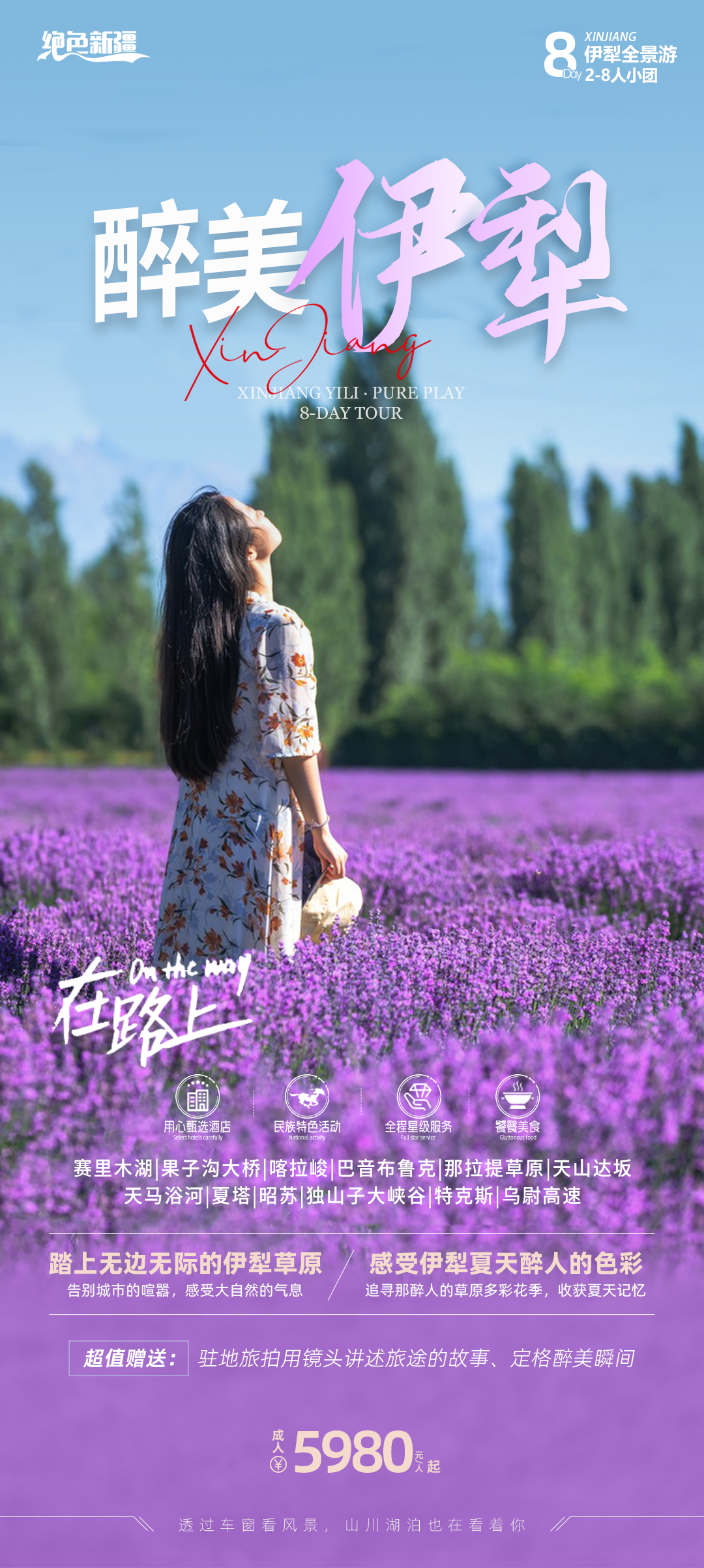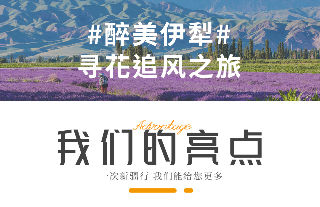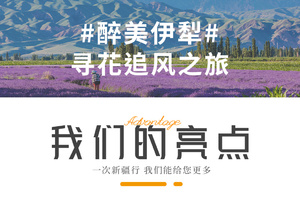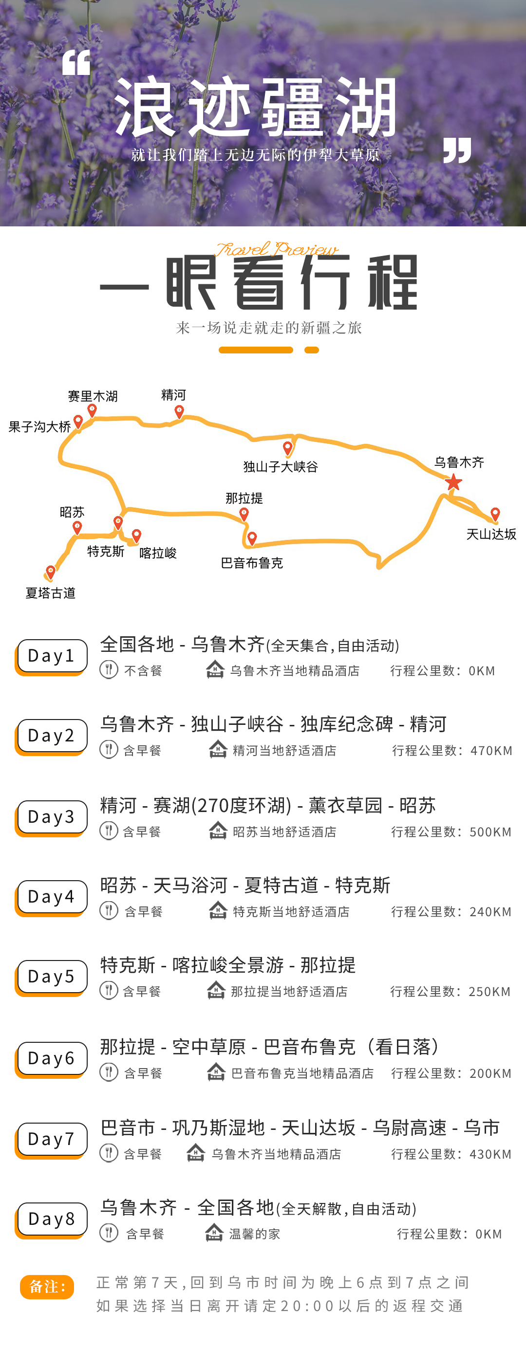 精河→150KM→270度赛里木湖→果子沟大桥→100KM→薰衣草园(1H)→250KM→昭苏