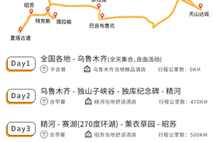 新疆地域宽广,日照时间较长,所以我们每天的行车时间比较长,请提前做好准备哟。另外为了避免肚饿,可以自备一些小零食。