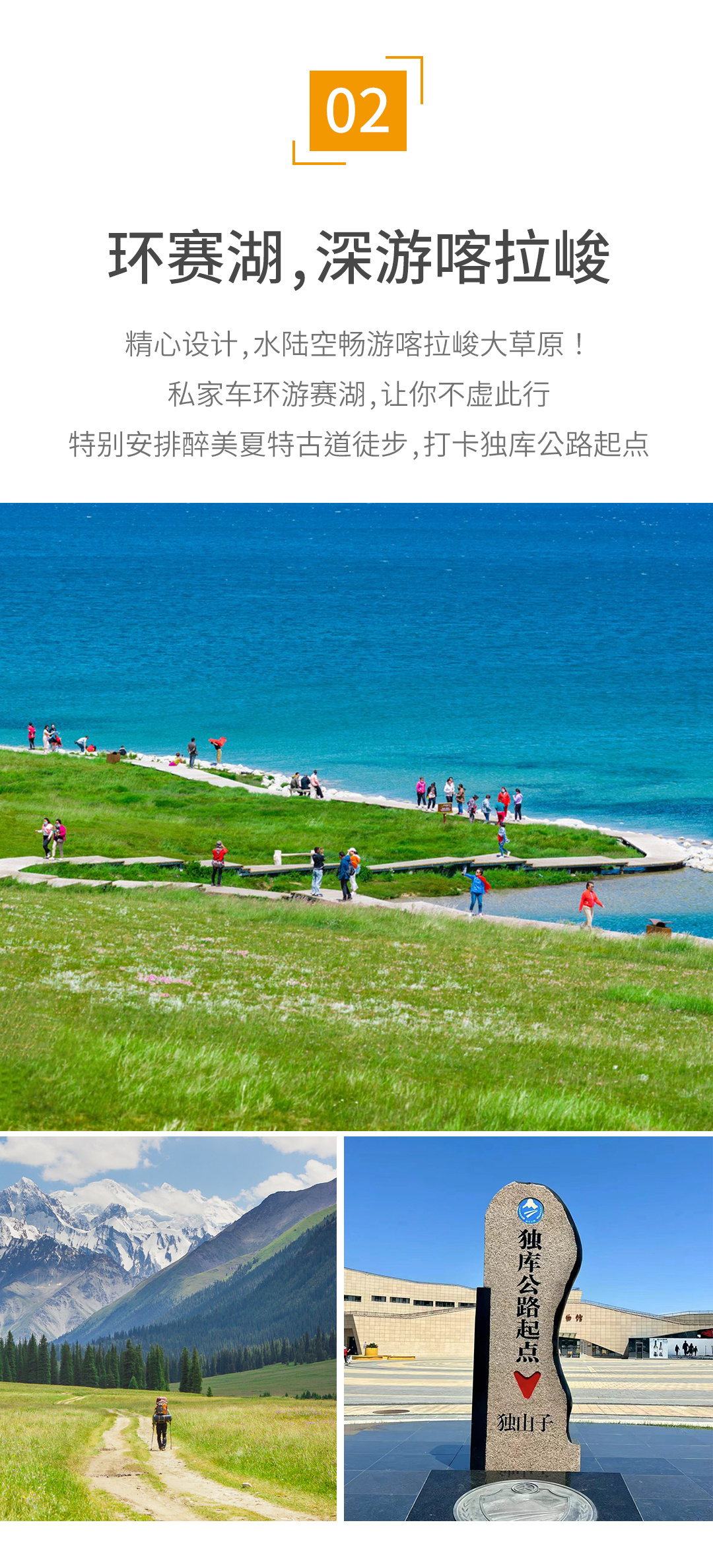 早餐后约8点半出发前往喀拉峻景区,行车约1小时抵达景区。今天我们买的是喀拉峻全景游套票,包含了游船,缆车,东喀拉峻+西喀拉峻,鳄鱼湾和各个喀拉峻景区有名的小景点。所以我们今天 在喀拉峻游玩的时间可以达到7个小时。“喀拉峻”是哈萨克语,意为“黑色苍茫的草原”。它不像其他的草原一样单一,定义了一种草原新景观,呈现了一种易于观赏的“立体草原”景观,俗称“人体山“。位于天山山腰的喀拉峻大草原,绵延无际,成群牛羊和点点毡房如同绿毯上的花朵,远处天山雪峰横亘。这个季节,在喀拉峻草原如同步入鲜花的海洋,各种野花恰似点点繁星,漫山遍野,望不到尽头。大家还可以深入五花草甸鲜花台以及喀拉峻大峡谷边缘,俯瞰空中草原和三级夷平面。今天我们可以在喀拉峻玩一整天,所以完全不用担心时间问题,你可以选择一段路徒步,也可以体验一下在真正的草原上骑马的感觉,也可以找一个地方发发呆。这里绝对不会让你失望……之后根据天气情况,我们适时前往那拉提入住(车程约2小时)。
