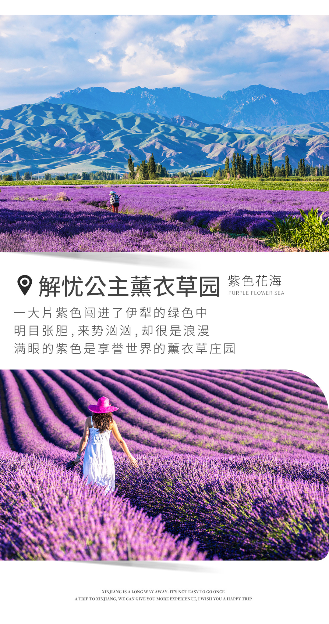 从景区出来,我们行驶在壮观宏伟的果子沟大桥上一路前行,抵达薰衣草庄园——解忧公主薰衣草庄园(原科古尔琴薰衣草园),这里是亚洲最大的薰衣草种植园,紫色的花瓣,烈日下茁壮绽放。远望科古尔琴是氤氲着紫色的朦胧;近看是如织游客的赏心悦目,一切都是美丽的存在。