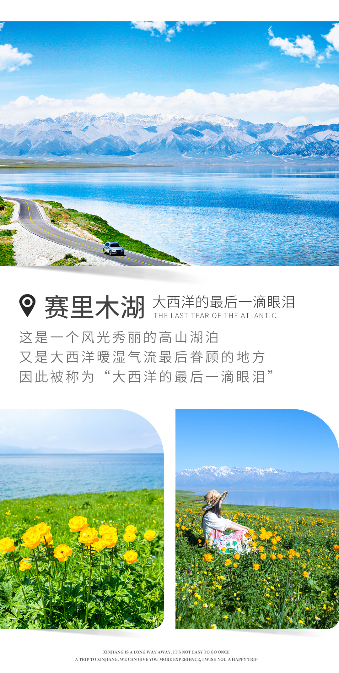 早上用完早餐出发,行车约2个小时,抵达赛里木湖。赛里木湖是新疆海拔最高、面积最大、风光秀丽的高山湖泊,又是大西洋暖湿气流最后眷顾的地方,因此被称作“大西洋最后一滴眼泪”,它背靠雪山,湖边是广阔的草原,湖水清澈蔚蓝,因风景绝美一直是新疆最著名的几大景点之一。这里最佳游玩季节是每年的六七月份,此时湖边草原上开满了各色的野花,应照着雪山下的蔚蓝湖水,是不可错过的盛景。今天还有本次行程的重点:赛里木湖环湖。我们的将带大家环湖,一边环一边下车游玩,从不同的角度欣赏赛里木湖的美。就这样绕湖游览高山湖泊优美自然景观,成吉思汗点将台及白天鹅自然保护区。而且我们游玩的时间也非常的充裕,美女们可以带上漂亮的裙子在湖边尽情的拍照,