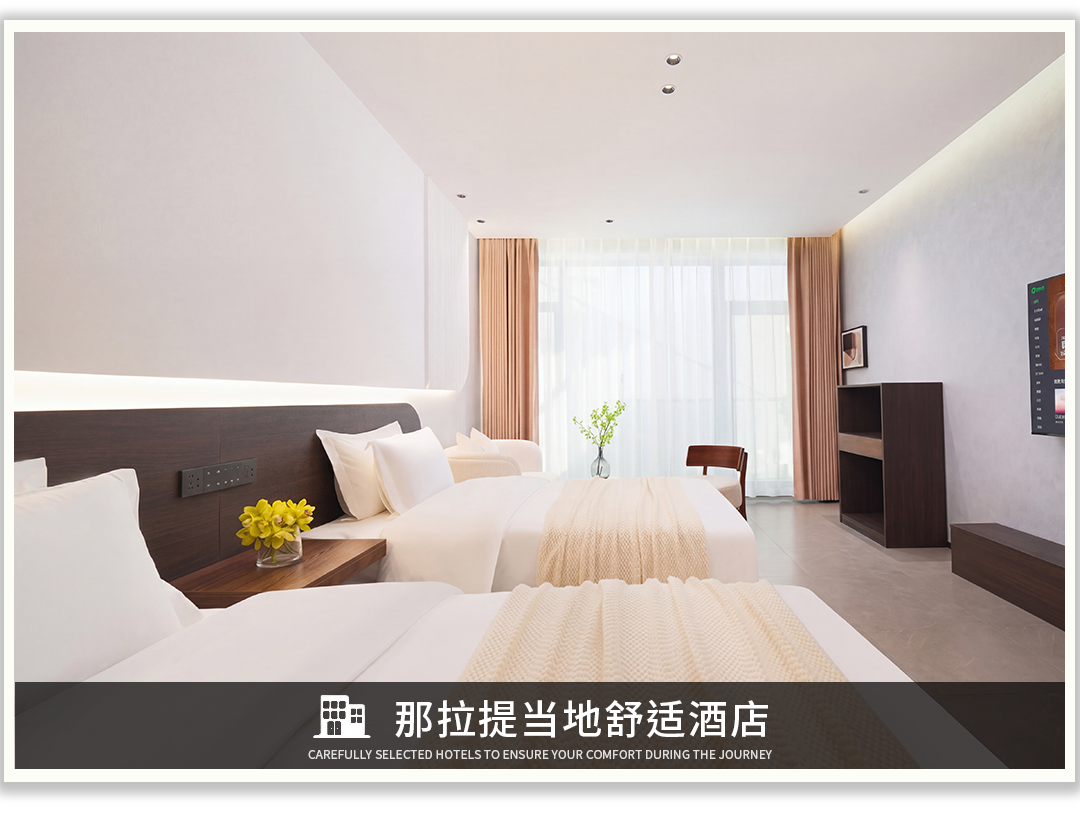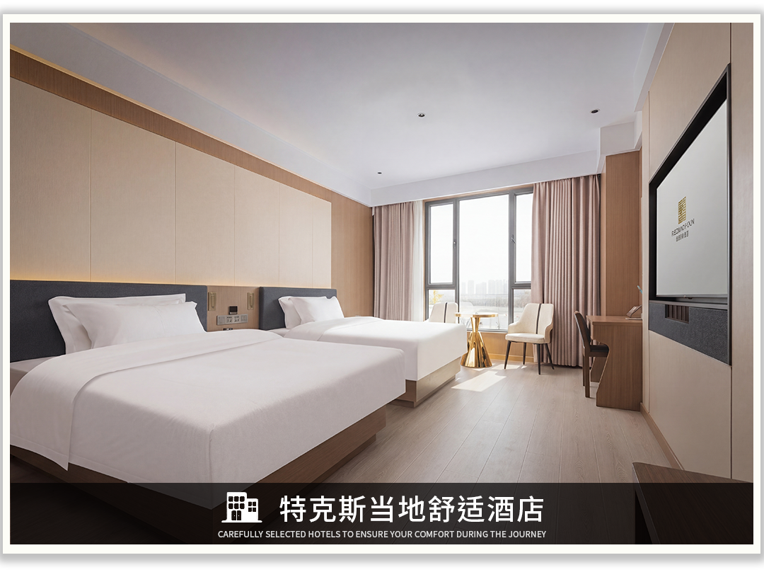 乌鲁木齐当地精品酒店两晚,精河县当地舒适酒店一晚,昭苏县城当地舒适酒店一晚,特克斯当地舒适酒店一晚,那拉提当地舒适酒店一晚,巴音布鲁克当地精品酒店一晚;