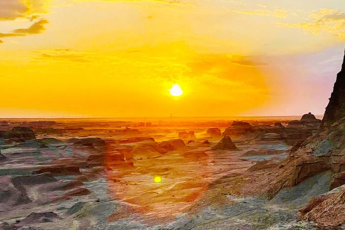 早上起床后,我们前往五彩滩,它位于我国新疆维吾尔自治区布尔津县西北约24公里的也格孜托别乡境内,我国唯一的一条注入北冰洋的河流———额尔齐斯河穿其而过。五彩滩一河两岸,南北各异。南岸,有绿洲、沙漠与蓝色的天际相合,风光尽收眼底。由于河岸岩层间抗风化能力的强弱程度不一而形成了参差不齐的轮廓,这里的岩石颜色多变,且在落日时分的阳光照射下,岩石的色彩以红色为主,间以绿、黄、白、黑及过渡色彩,色彩斑斓、娇艳妩媚,因此被称作“五彩滩”,并号称是“新疆最美的雅丹地貌”。