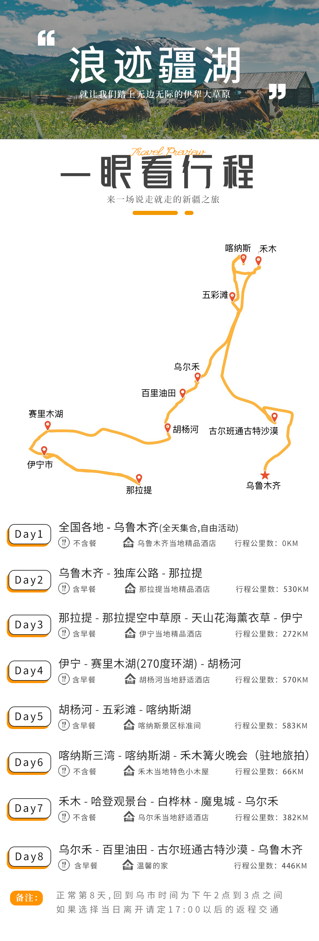 备注:1.独库每年开通时间为五月底六月初,如出发时独库未开通第二天则改走乌尉高速+天山最美隧道抵达那拉提。