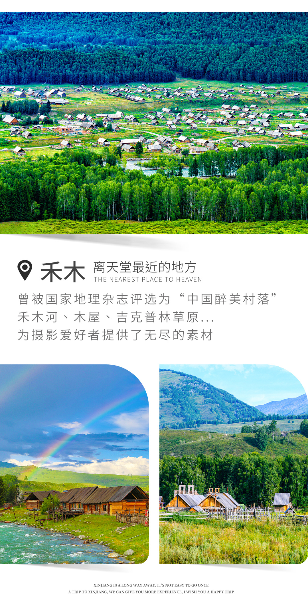 禾木是一个有几百户人家的小村落,以游牧为生。禾木的小河、木房、炊烟、桦林及桥上放牧的人们……汇集成一幅幅优美的风景画。是摄影的天堂,禾木河、木屋、吉克普林草原 为摄影爱好者提供了无尽的素材。禾木非常地安逸,禾木河的两岸,适合发呆,沿途游览白雾环绕的禾木河,喀纳斯河谷,漫山流丹溢彩,白桦树在夕阳的余晖下闪耀着金色的光芒,牛羊正在悠然自得地吃着草,小木屋哈萨克毡房错落有致地散在禾木河边,牧归时分。