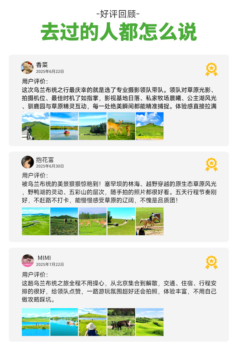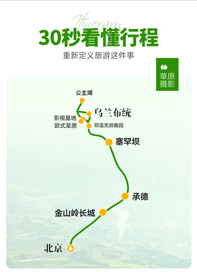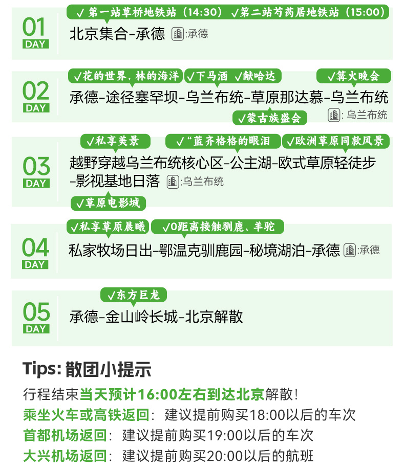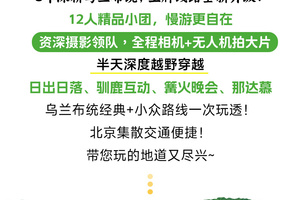 中午在景区附近自由午餐或领队组织AA吃饭,午饭后集合返京(150KM,车程2-2.5小时)。非常幸运和大家共享草原之旅,期待我们的下次相遇。