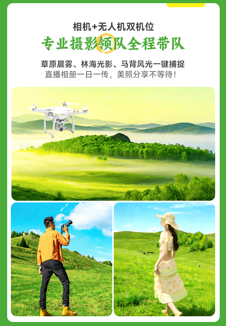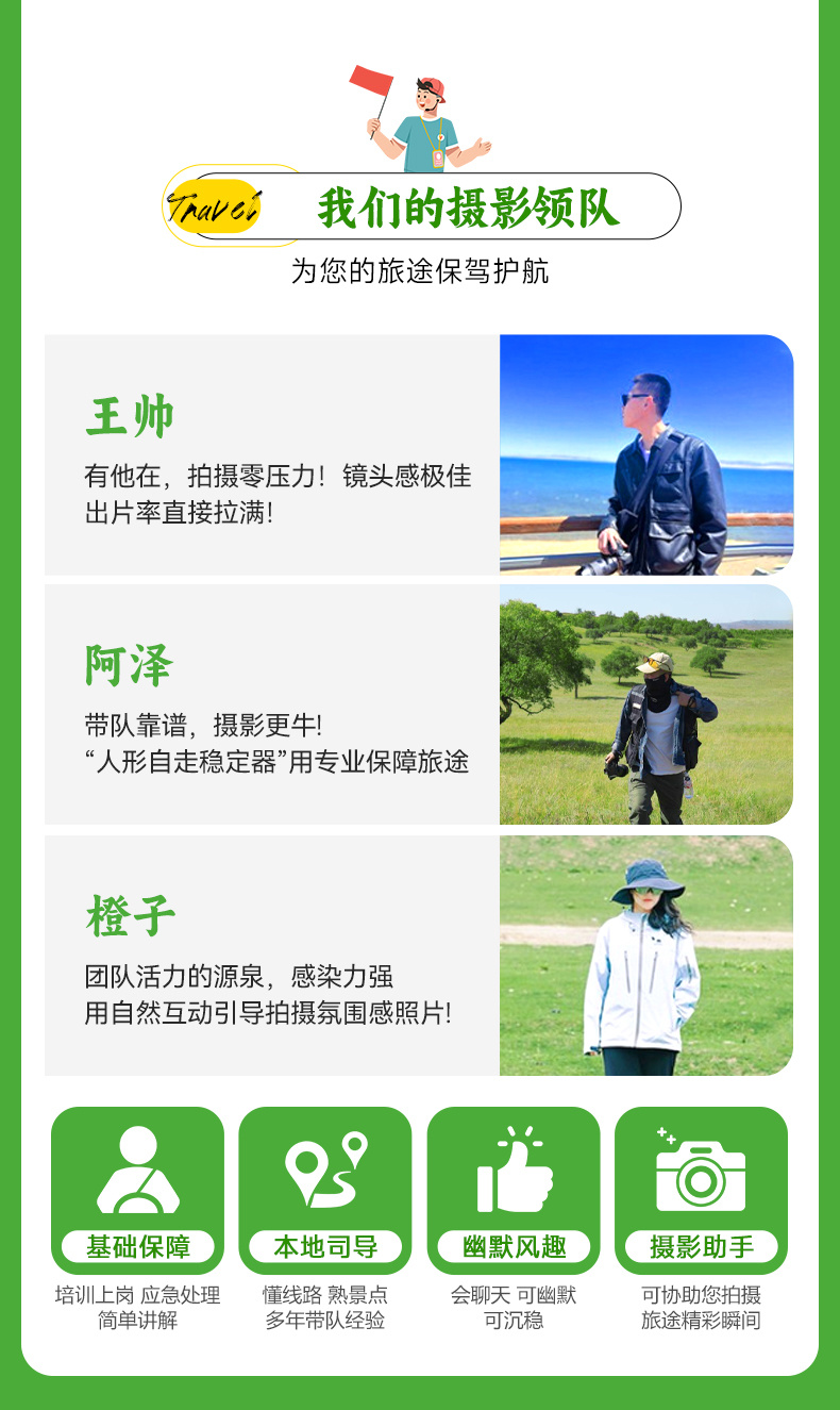 7、领队:6人及以上安排摄影领队带团,配备单反+无人机航拍+相册直播。(5人及以内司机兼向导,司机可提供向导、简单介绍、代办住宿等服务,无法像领队一样提供讲解、景区伴游等服务);