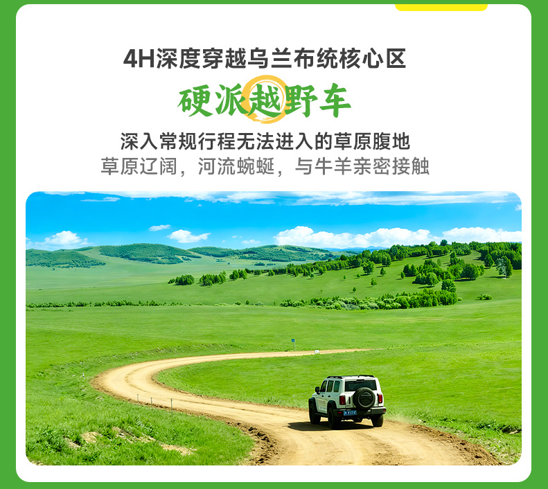 今日解锁乌兰布统深度玩法——草原【越野穿越】,一路翻山越岭,穿梭在林海、草原、湖泊、湿地之间,解锁不重样的塞外盛景,沉浸式感受草原的原始与壮阔。