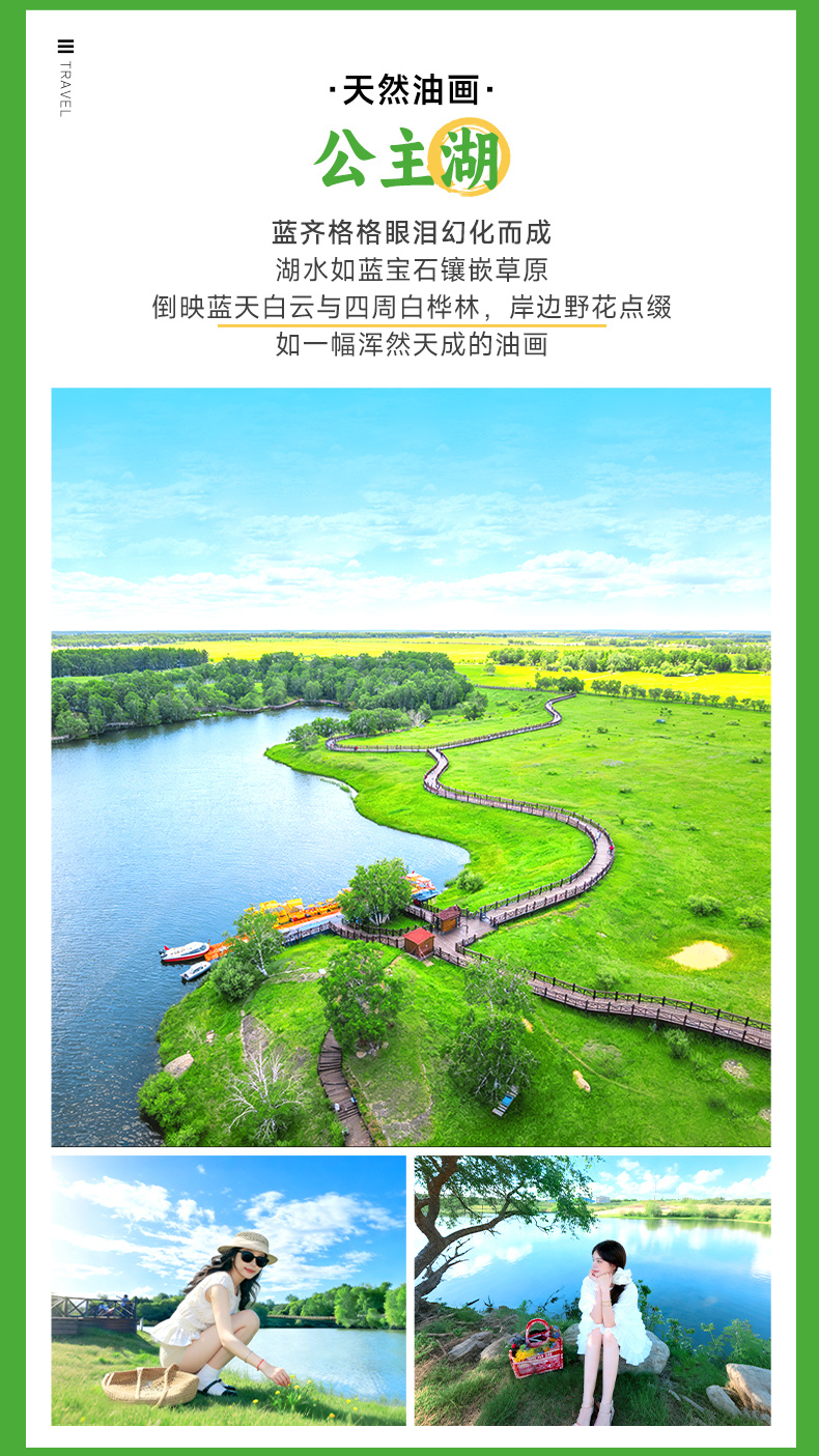 下午奔赴素有 “蓝琪儿眼泪” 之称的【公主湖】(游玩约 1 小时),澄澈湖水依偎着辽阔草原,牛羊马群悠然踱步,湖光草色间,既有自然的温柔浪漫,也能打卡草原特色美食、体验趣味探险项目,解锁多重快乐。