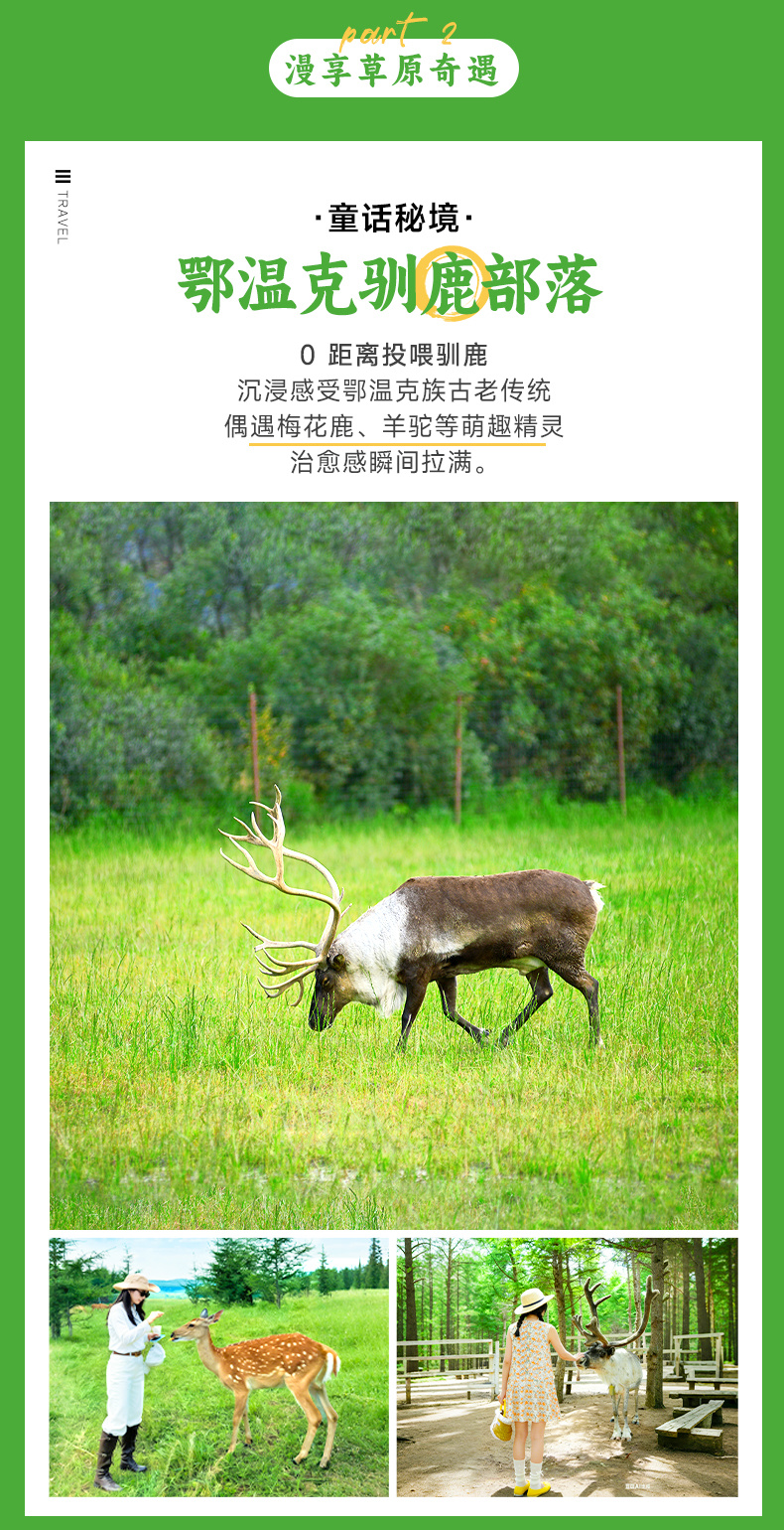 上午奔赴【鄂温克驯鹿园】,邂逅草原上的精灵~园内散养着成群的鄂温克驯鹿、软萌的梅花鹿与羊驼,各类生灵在此自在栖息,满眼都是鲜活生机。漫步园中可与驯鹿近距离互动,亲手投喂苔藓,看温顺的驯鹿低头觅食,指尖轻触它柔软的茸角,感受与草原精灵相伴的治愈瞬间。