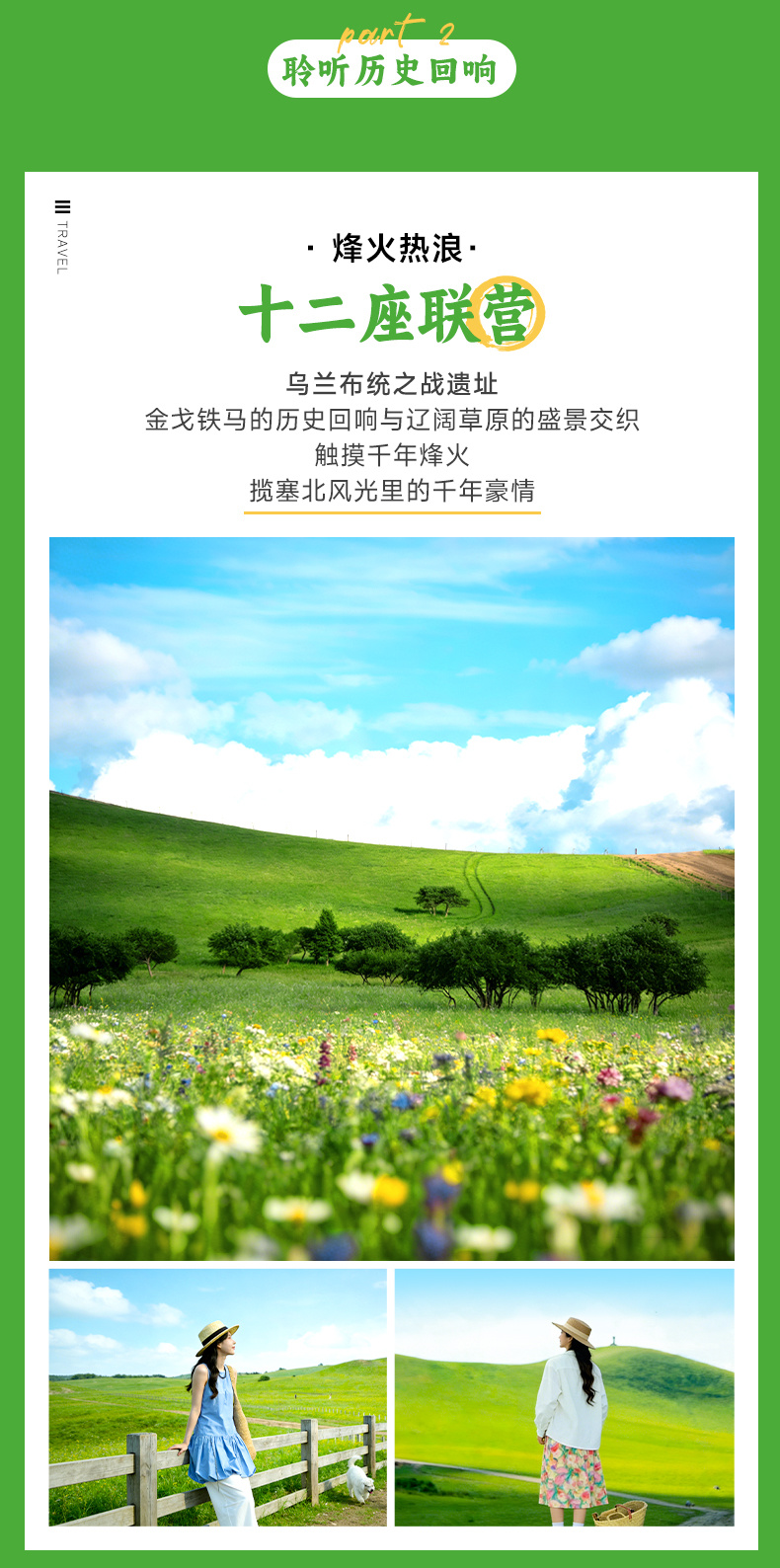【十二座联营】是历史遗迹,康熙皇帝当年平定噶尔丹叛乱时,曾在此安营扎寨,站在这里,远眺草原全景,遥想当年康熙大军的壮阔气势,抚今忆古,别有一番滋味。