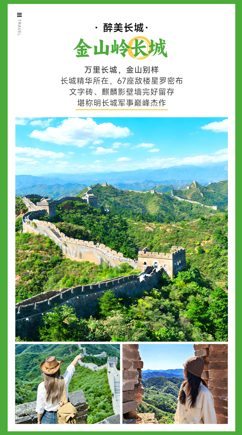 早餐后,乘车前往素有“万里长城,金山独秀”之称的【金山岭长城】(85KM,车程1-1.5小时),金山岭长城始建于明洪武元年,西望古北口,东连司马台,此时的金山岭长城内外百花争艳,云海飘渺浩瀚,更添气势。