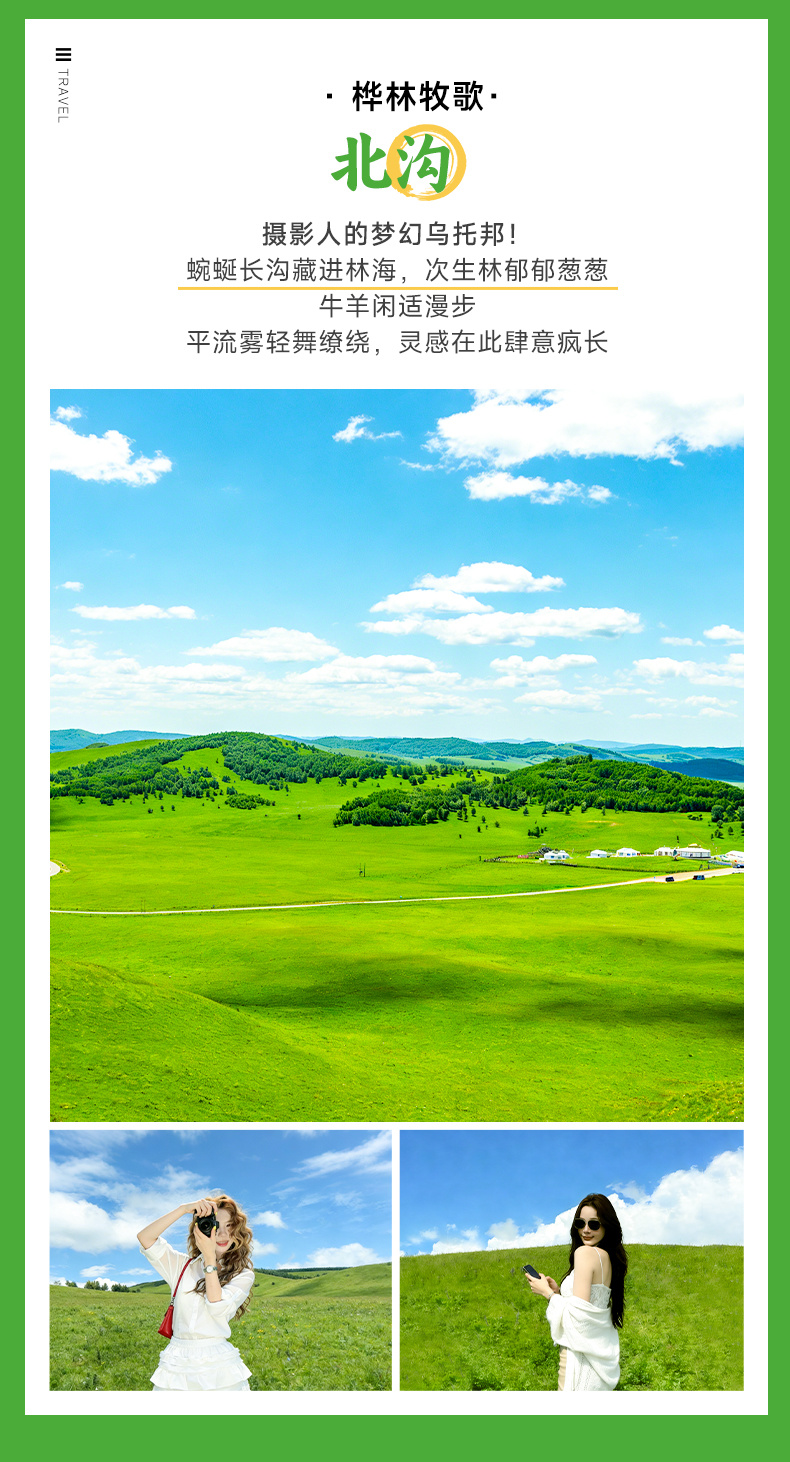 【北沟】沉浸式体验 “风吹草低见牛羊” 的经典意境,这里是马场天然放牧区,山坡白桦成林,沟底塘柳错落,蓝天、白云、碧草、牛羊相映成趣,感受草原原生态之美。
