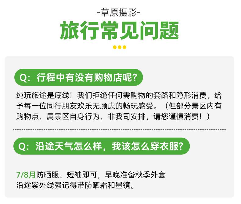 ①衣服:5/6月气温较低,需准备厚一些的外套,如夹克、风衣或薄羽绒服,也可带上围巾和手套增加保暖效果,7/8/月防晒服、短袖即可,早晚准备秋季外套。沿途紫外线强记得带防晒霜和墨镜。
