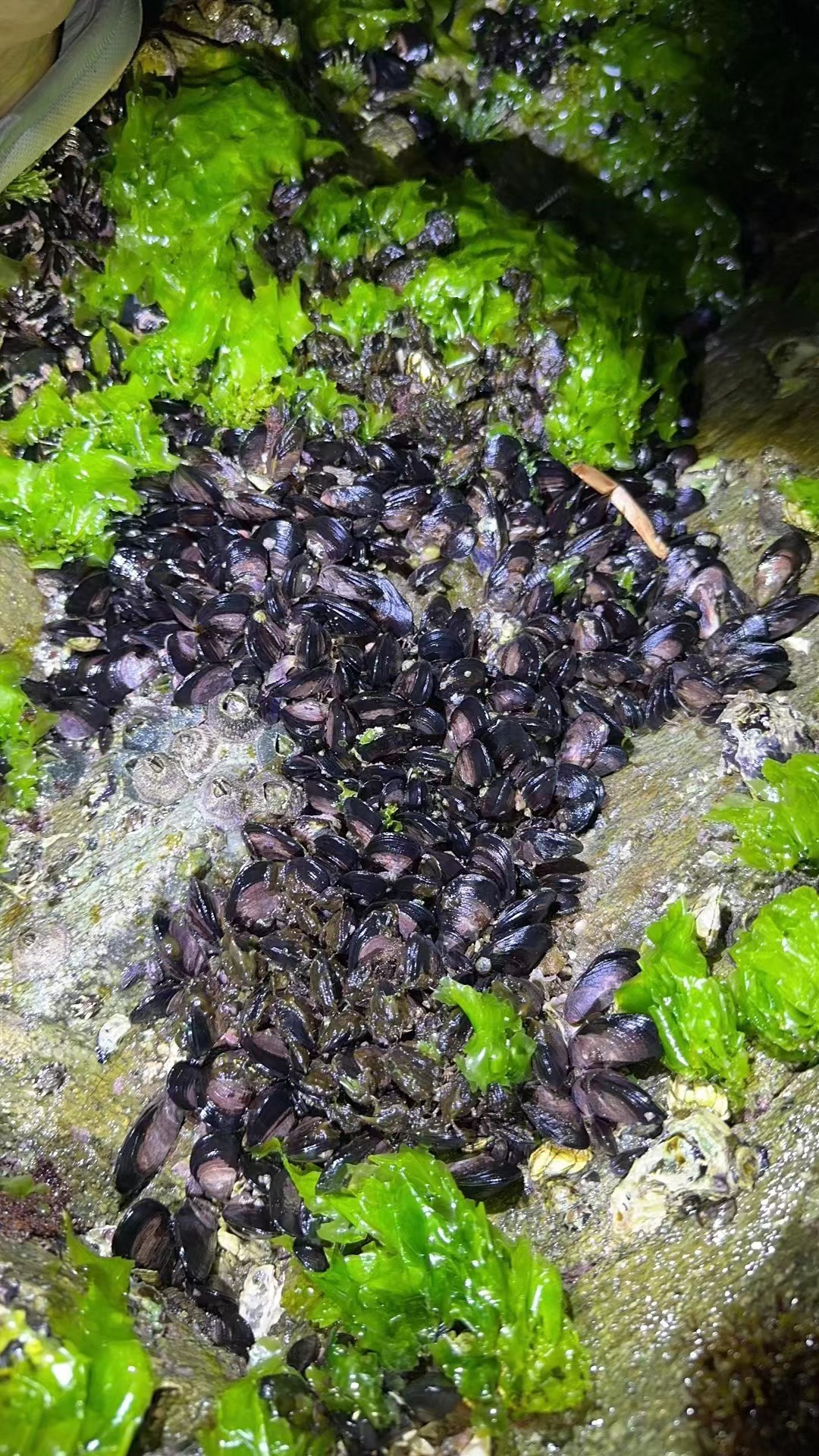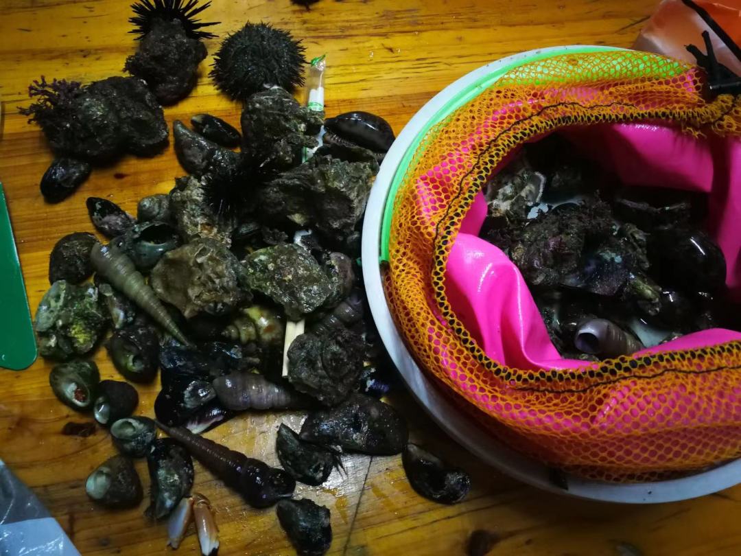 在礁石边就很容易弄到一些石鳖、将军帽、海虹、生蚝、牛角螺、猫眼螺、八爪螺、佛手、沙白、花甲、青口、猪仔螺、苦螺、螃蟹、藤壶等等▼